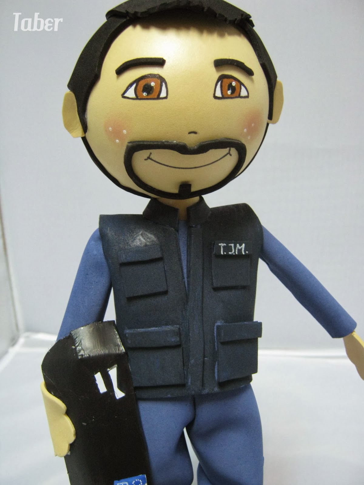 El muñeco de PEPE lo encargó su mujer. Nos trajo las fotos con mucho tiempo y yo iba metiendo otros muñecos antes porque corrían mas prisa y este era mas complicado, porque lo querían con herramientas, con matriculas de coche, parachoques... vamos, bastante completo. Nos dijo como tenia que ir vestido y debía llevar un cartel anunciando su taller. Luego no resultó ser tan complicado. Cuando la mujer lo vio dijo ¡Pero si es mi marido!. Se que les gustó mucho porque vino la madre de él a preguntar por las muñecas para encargar una para su hija y les decía a las amigas ¡el de mi hijo es que es clavado!. Es verdad que cuando lo vio mi hermana dijo ¡este lo conozco yo, este es vecino mio!. Mas adelante hice el de su hermana. Ya lo pondré.